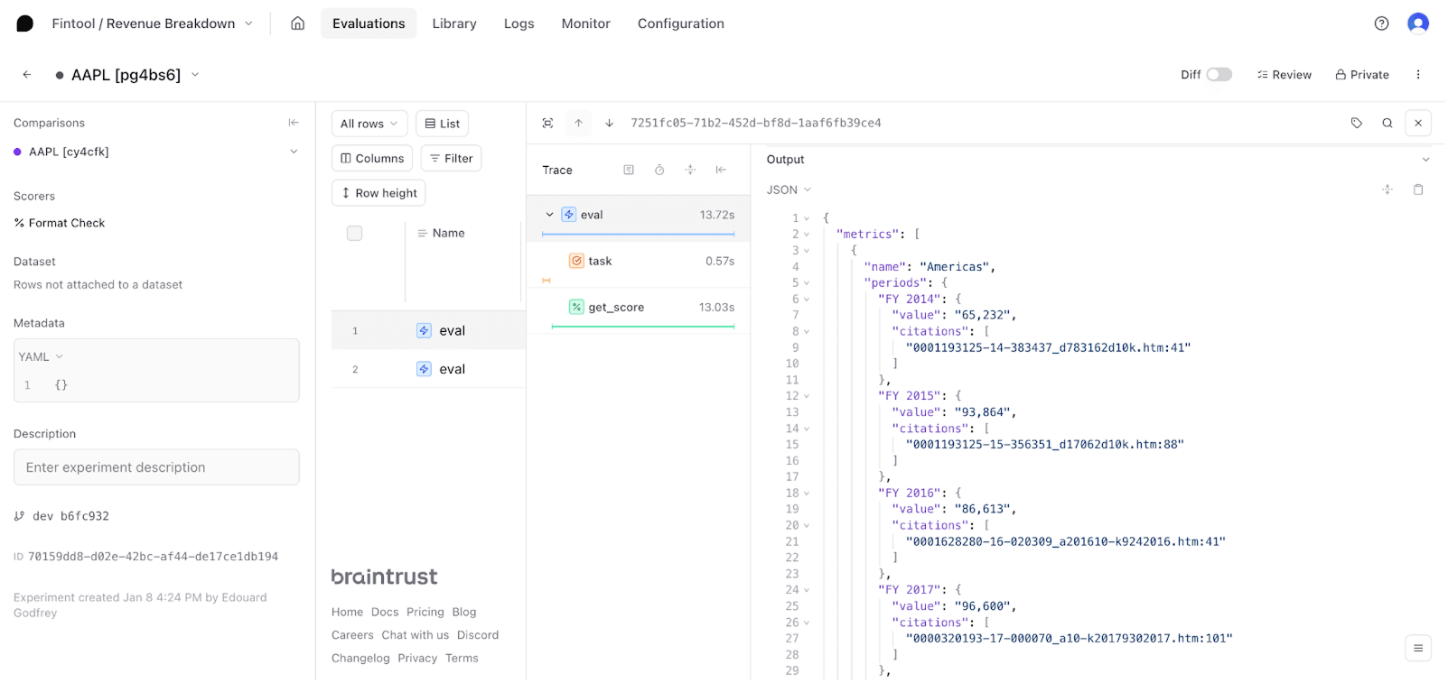 They don’t just check that sources are included. They also make sure they’re valid, properly formatted, and tied directly to the insights. The team set up custom rules in Braintrust, like requiring SEC IDs and double-checking quoted text, and real-time monitoring catches anything that doesn’t meet the standards.