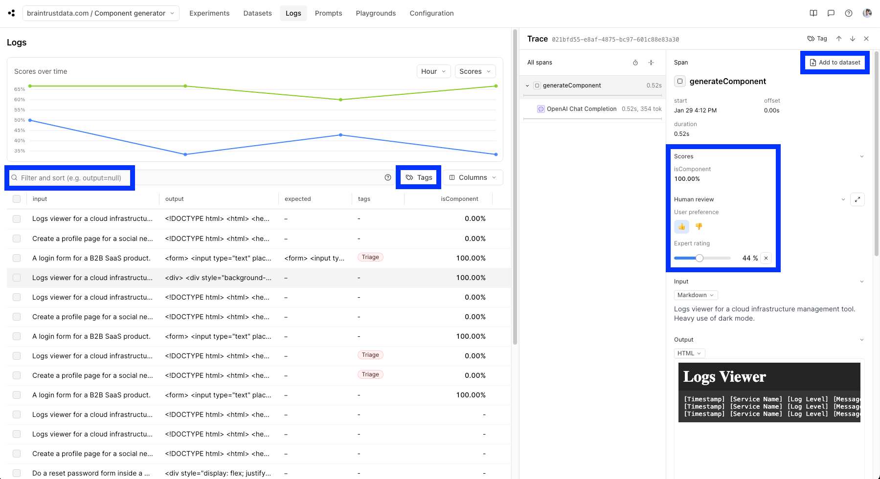 Braintrust is purpose-built for this workflow. The Zapier team uses Braintrust to log user interactions, dig into their logs, track customer feedback, filter on that customer feedback, and directly add interesting logs to their test sets. Braintrust’s datasets feature also abstracts away the pain of managing and versioning test sets.
